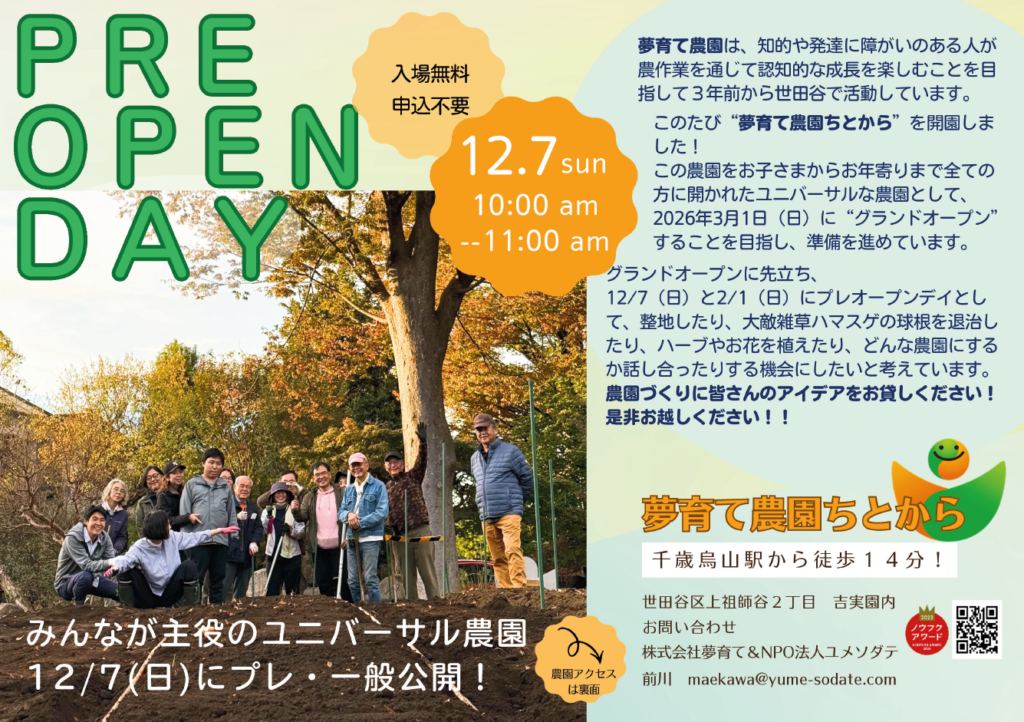 夢育て農園ちとからは、誰にも開かれたユニバーサル農園を目指します。来年3月1日のグランドオープンに向けて、12月7日、今度の日曜日にプレオープンデイを開催します(次は2月1日(日))。