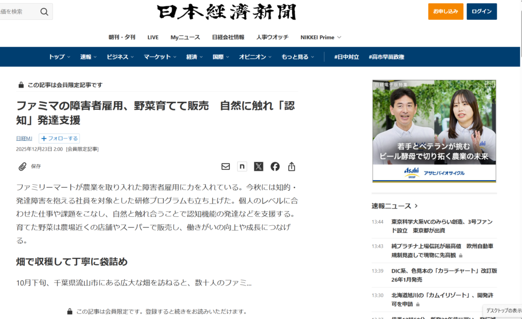20251223 ファミマの障害者雇用、野菜育てて販売  自然に触れ「認知」発達支援 https://www.nikkei.com/article/DGXZQOUC233TX0T21C25A0000000/