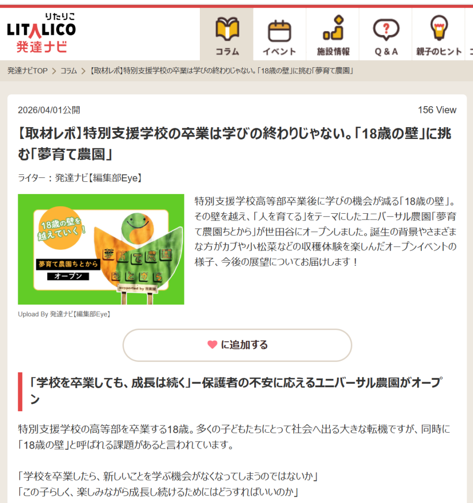 2018年にNPO法人ユメソダテを立ち上げた時にも、2020年にニコニコインのクラウドファンディンをした時にも、そして2022年に夢育て農園を開園&人を育てる畑を開講した時にも、LITALICO発達ナビは、良質な記事を掲載して下さいました。